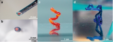 基于原位UV固化的墨水直写(DIW)可以处理多种材料并构建复杂的3D结构。但是UV穿透性低,无法实现多尺度和大跨度的无支撑3D打印。课题组率先建立了结合DIW和近红外(NIR)诱导的上转换粒子辅助光聚合方法,提高了墨水原位固化过程中光源穿透性和聚合均一性。通过墨水设计,该方法可实现多色物体、黑色物体、高固含陶瓷的多尺度、大跨度的无支撑3D打印,突破了传统DIW的局限。