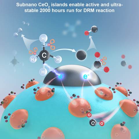 刘小浩教授团队在Cell Press细胞出版社旗下期刊Chem Catalysis上发表了题为“Strong activity-based volcano-type relationship for dry reforming of methane through modulating Ni-CeO2interaction over Ni/CeO2-SiO2catalysts”的研究论文,文章链接:。团队通过在SiO2载体上构建超细CeO2纳米岛实现了可控调节CH4解离,同时大幅强化CO2吸附与活化,加速表面的消碳反应,并有效促进积碳物种远离催化剂表面,从而实现了催化剂的高活性与超稳定性。催化剂在恒温800°C下CO2和CH4转化率分别为96%和92%,无副反应、无失活稳定运行2000小时。