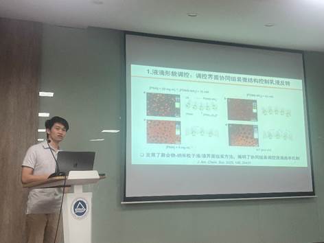 黄才利教授围绕非平衡态界面调控与功能化的主题,介绍了其团队利用聚合物诱导纳米粒子的界面非平衡态动力学调控来稳定并操控界面张力大的多组分液相界面,在聚合物复合功能界面材料构造及调控,尤其是在液滴界面设计、液滴耦合及液体涂覆方面取得的创新成果。