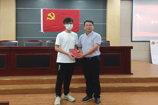 在随后的环节中,学院领导、行政党支部教师和各学生党支部书记共同为预备党员佩戴党员徽章,颁发党章和党史学习教育笔记本。新党员梅佳冰同学激动地说:“戴上党徽的一瞬间,感受到的不仅仅是喜悦,还有那一份沉甸甸的责任。我将不负期望,肩负使命,继续前行!”