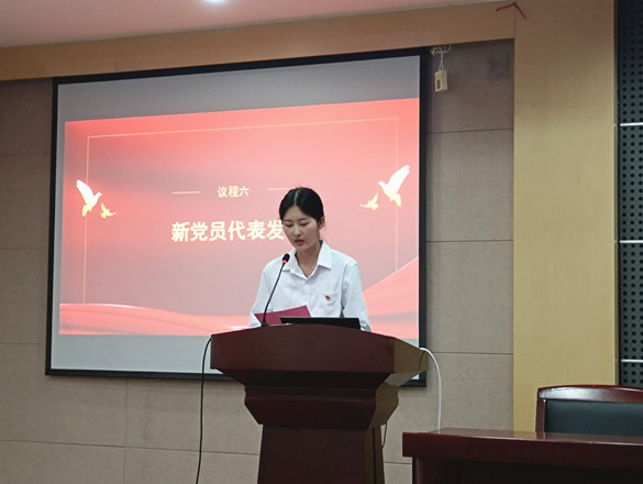 老党员陶文沂微视频之后,全体新党员心潮澎湃,现场响起热烈的掌声。新党员代表姜雨同志发言,她表示身为朝气蓬勃的化工学子,应主动钻研自身专业技能,加强实验操作与科研能力,既要得到真学问、练就真本领,又要有锲而不舍、自强不息的奋斗精神。她代表新党员向党做出庄严承诺,在现阶段会勤学苦练,打牢基础,争取在将来为化工行业的蓬勃发展注入化工力量,让祖国以更强大的姿态站在国际舞台上。