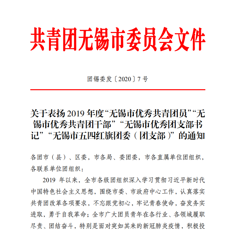 近日,共青团无锡市委员会发布《共青团无锡市委员会关于表扬2019年度“无锡市优秀共青团员”“无锡市优秀共青团干部”“无锡市优秀团支部书记”“无锡市五四红旗团委(团支部)”的通知》,共青团黄漫
