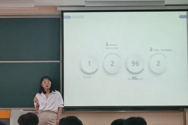 讲座开始,宋超慧向同学们讲述了自己的求职经历。她指出,任何的收获都不是巧合,而是通过日复一日的努力与坚持得来的。在一年多的准备期间内,她坚持每天七点晨读,从未迟到;坚持每天晚间练习,再晚也不会缺席。凭借着自己的努力,她还未毕业就已拥有两份世界500强的实习offer。在求职过程中,她投递了96家公司,最终选择了宝洁。