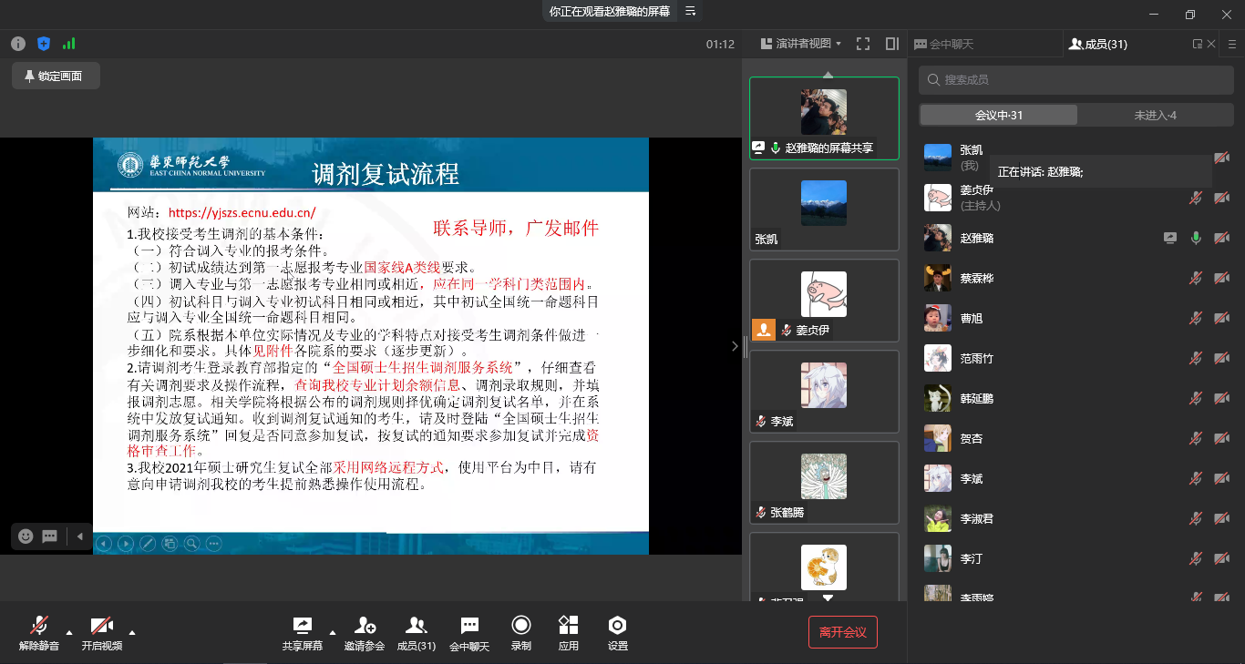 在上午的调剂经验分享专场,2021届本科毕业生宋睿(辽宁大学)、赵雅璐(华东师范大学)、张清润(华南理工大学)、石进(黄漫