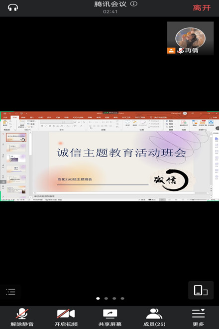 为进一步提高同学们的诚信和责任意识,引导同学们树立并践行社会主义核心价值观,同时促进同学们的全面发展。5月17日晚,应化2102班于线上召开资助“诚信”主题班会,此次会议由组织委员冉倩主持。