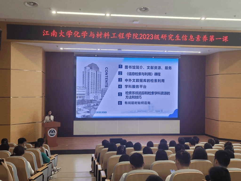 图书馆的化学与材料工程学科馆员严而清主讲,化工学院2023级全体研究生到场参加。