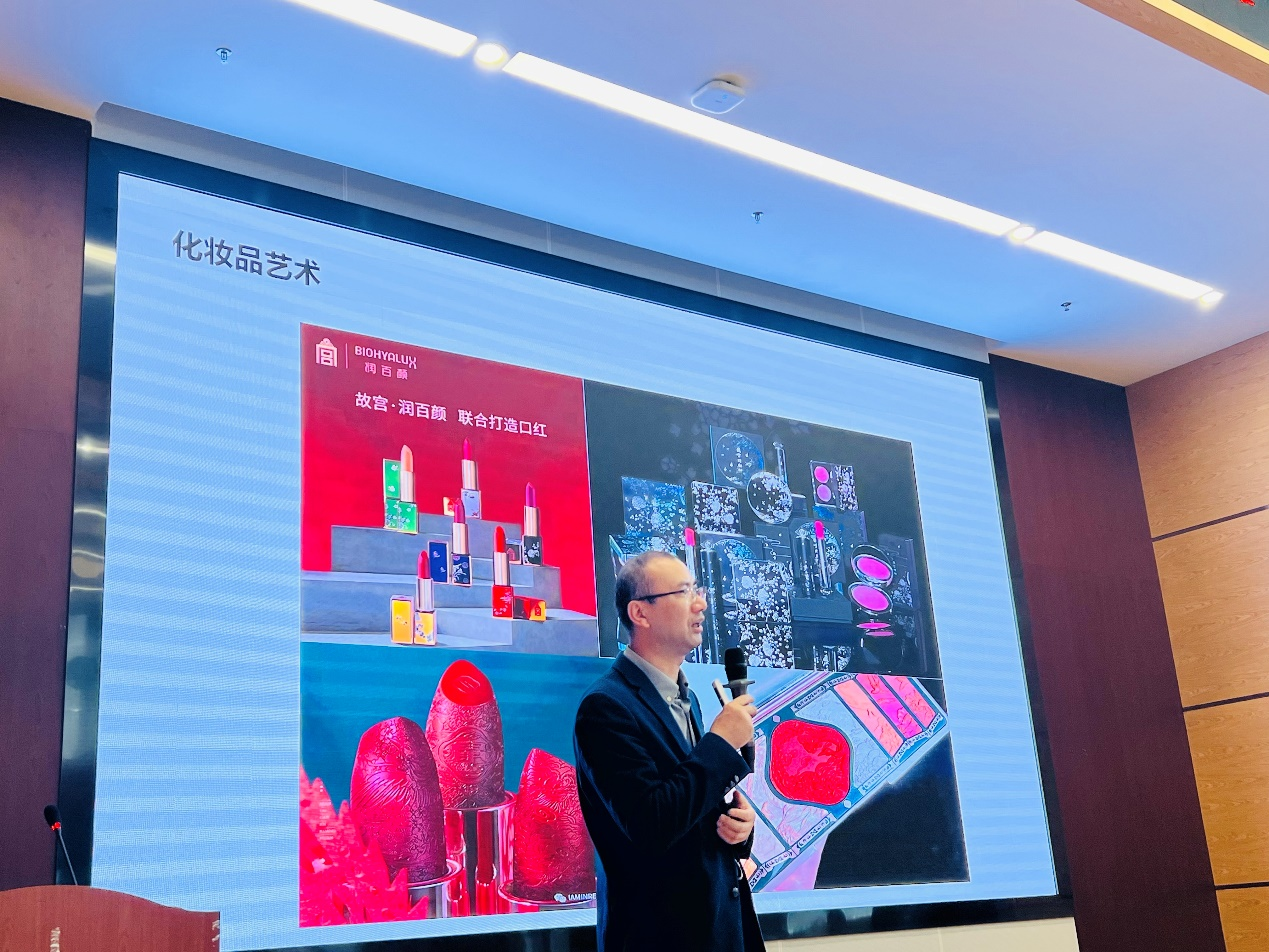 杨教授讲述了国内外化妆品从古至今各时期的特点,通过几个化妆护肤品行业巨头和传奇人物的故事吸引同学们的兴致,让同学们初步了解了化妆品发展的历史脉络;紧接着,他又从多个案例切入,向同学们介绍了化妆品中蕴含的化工科技,涉及洗护、抗衰、防晒等方面。随后,杨老师谈及化妆品与艺术的联系,他表示,人们对美丽的追求从未间断,在满足妆容的美观之余,在产品包装和柜台设计美学方面也提出了新的要求,呼吁材料相关学子对此开展探索。最后,杨老师介绍了当前微生物护肤的最新研究进展,同时提出人工智能在个性化定制化妆品中的应用,引发同学们对未来化妆品与人工智能交叉领域的思考。
