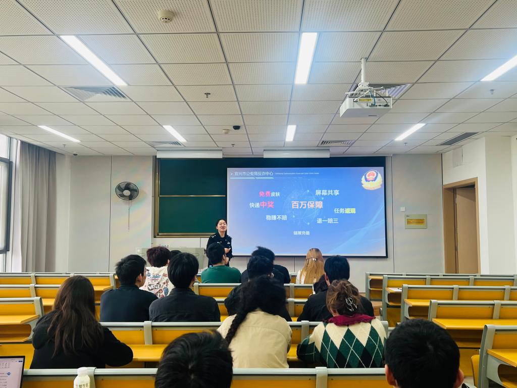 反诈骗主题培训邀请了宜兴市公安局反诈中心民警高警官到场,为学生带来了一场内容丰富的反诈知识讲座。高警官通过真实的案例分析,向学生传授了识别和防范电信诈骗的技巧,提高了学生的自我保护意识和能力。