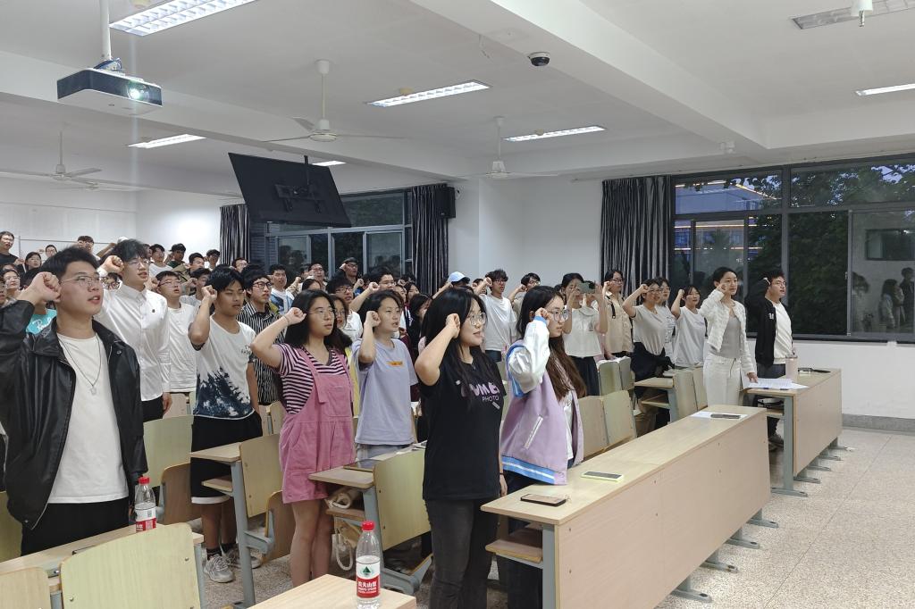 活动伊始,赵文悦、刘扬帆、周永安、侯欣驰四位同学朗诵《少年中国说》,激情澎湃的朗诵让团员们感受到梁启超先生对青少年的殷切期盼和坚定信心,激发团员青年在中国式现代化建设中挺膺担当的决心。通过集体观看革命历史题材电视剧《觉醒年代》片段,让团员们情景式走近并了解百年前五四运动中国先进分子和热血青年所经历的“觉醒年代”。知识问答环节,酣畅淋漓的知识抢答加深了同学们对五四运动的认识。活动最后,全体团员青年在李长珂的带领下,重温入团誓词并与团旗合影,回忆曾经入团时的那份激动、兴奋与憧憬,进一步感受历史沉淀的厚重与伟大。