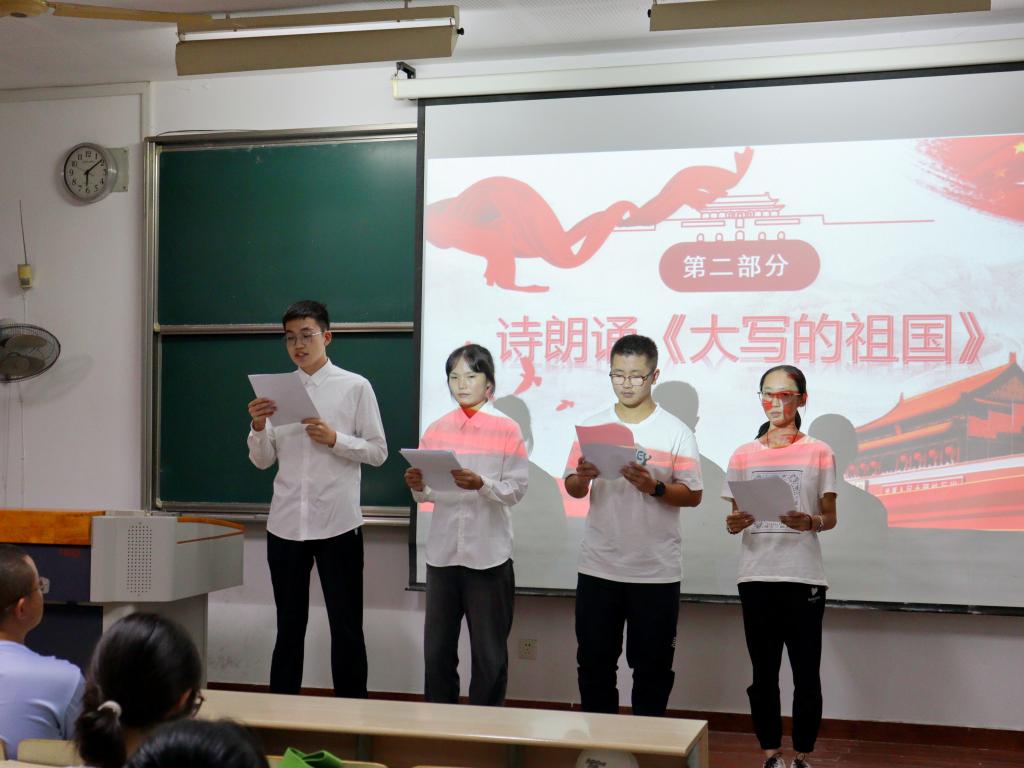 活动伊始,全体同学起立,高唱国歌,铿锵有力的歌声为本次活动揭开序幕。彭仪敏、侯欣驰、李子悦、陈逸峰朗诵《大写的祖国》,激情澎湃的朗诵将气氛推向了高潮,朗诵者们用激昂的声音诉说着对祖国的热爱,字字句句都饱含着青年学生对祖国的深情告白。