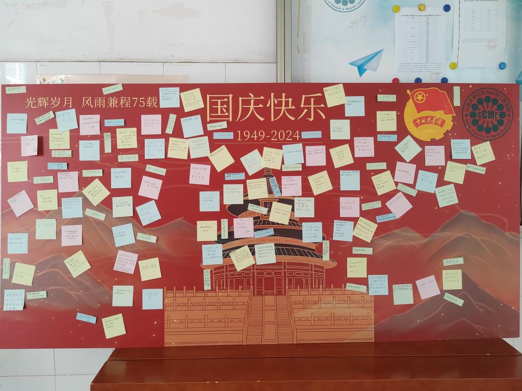 活动现场还放置了祝福告白墙,同学们写下对祖国大好河山的赞美以及对中华人民共和国成立75周年来的辉煌成就发出赞叹:“山川锦绣 国富民强”、“祝愿祖国天更蓝 山更绿 水更清”、“青春为中国式现代化挺膺担当”等等,一张张彩色便签上,书写着同学们对祖国的殷切祝福。