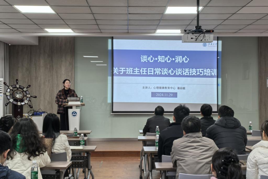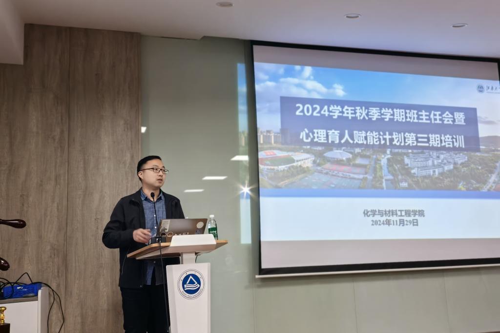 于11月29日下午在化工楼A316会议室开展班主任工作会议暨心理育人赋能计划第三期培训。学院党委书记潘庆伟,学工办主任、分团委书记鞠峰,校心理健康教育中心专职教师潘焱毓,学院全体辅导员和班主任参加本次活动。