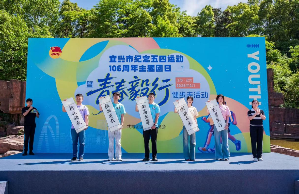 在山林之间、步道之上,“青春毅行”活动正式启动。现场设置青春集市,展示青春风采、青创成果,宜兴市人才政策以及便利服务。全体党员沿龙背山森林公园主入口出发,进行全程约5.4公里的徒步活动。毅行沿线围绕五四精神核心内涵—“爱国、进步、民主、科学”设置四个主题打卡点。参与者完成打卡可领取一枚拼图式冰箱贴,四枚拼图组合后完整构成“青春宜兴”图案,既具纪念意义,也寓意青年在理想信念的接力中不断凝聚奋进力量。