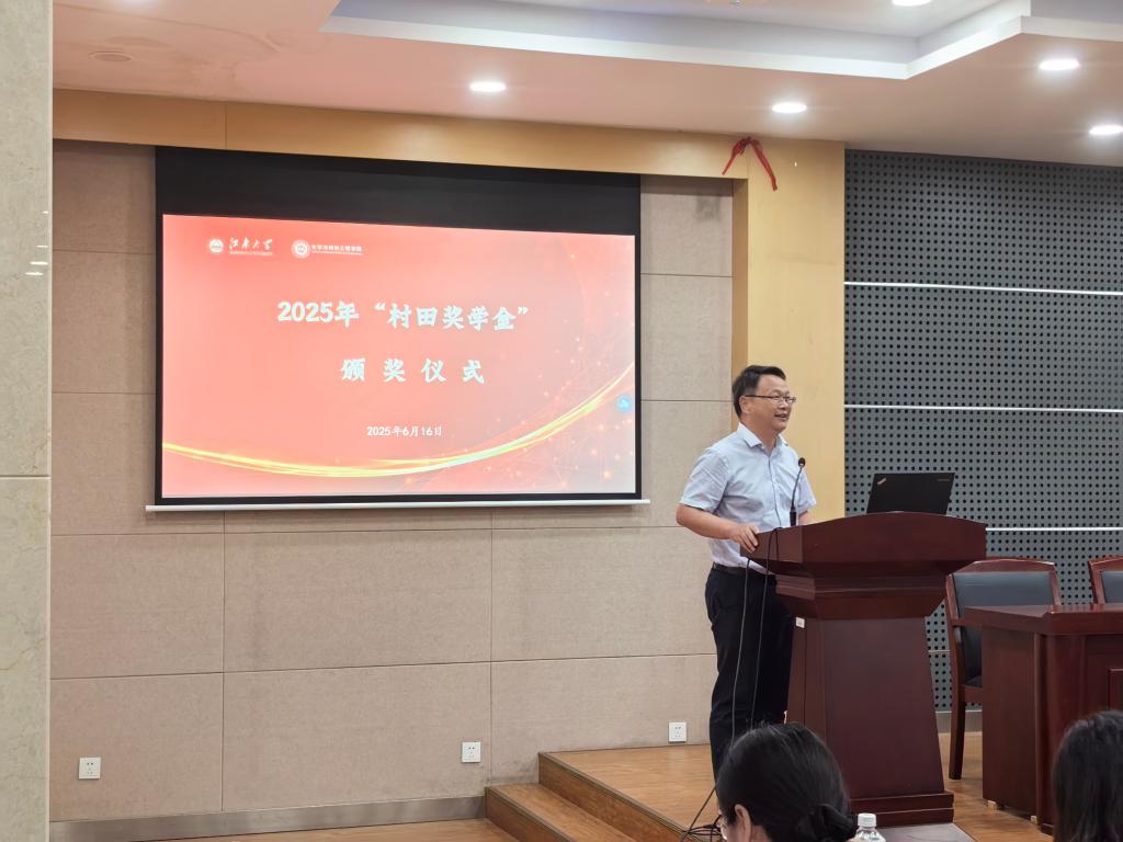 在化工楼B329举行村田奖学金颁奖典礼。无锡村田电子有限公司董事长、村田新能源(无锡)有限公司董事长、总经理山崎俊信,村田新能源(无锡)有限公司副总经理小山正人,村田新能源(无锡)有限公司管理统括部统括部长丁玮等10位企业代表, 黄漫