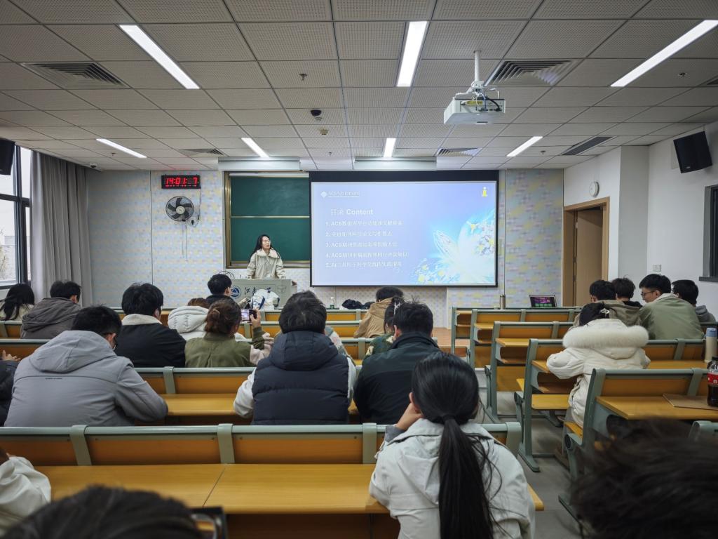 在本次讲座中,虞昊安首先对SciFinder Academic美国化学文摘库(CA)和ACS数据库进行了介绍。两者是化学化工领域的重要资源,对于化工学院的学生来说,掌握这两件重要工具的使用方法大有裨益。随后虞昊安系统梳理英语期刊科技论文的写作要点与规范、规避常见误区,全面介绍ACS期刊资源动态、适配投稿推荐及全流程操作注意事项,深入解析ACS期刊审稿流程、同行评议原则与审稿/回应技巧,同时分享AI工具在文献整理、论文润色等科学交流场景的实践应用及学术规范要求,为参会同学们提供了覆盖文献检索、论文写作、投稿审稿及学术交流全流程的实用指导,助力提升科研效率与学术产出质量。