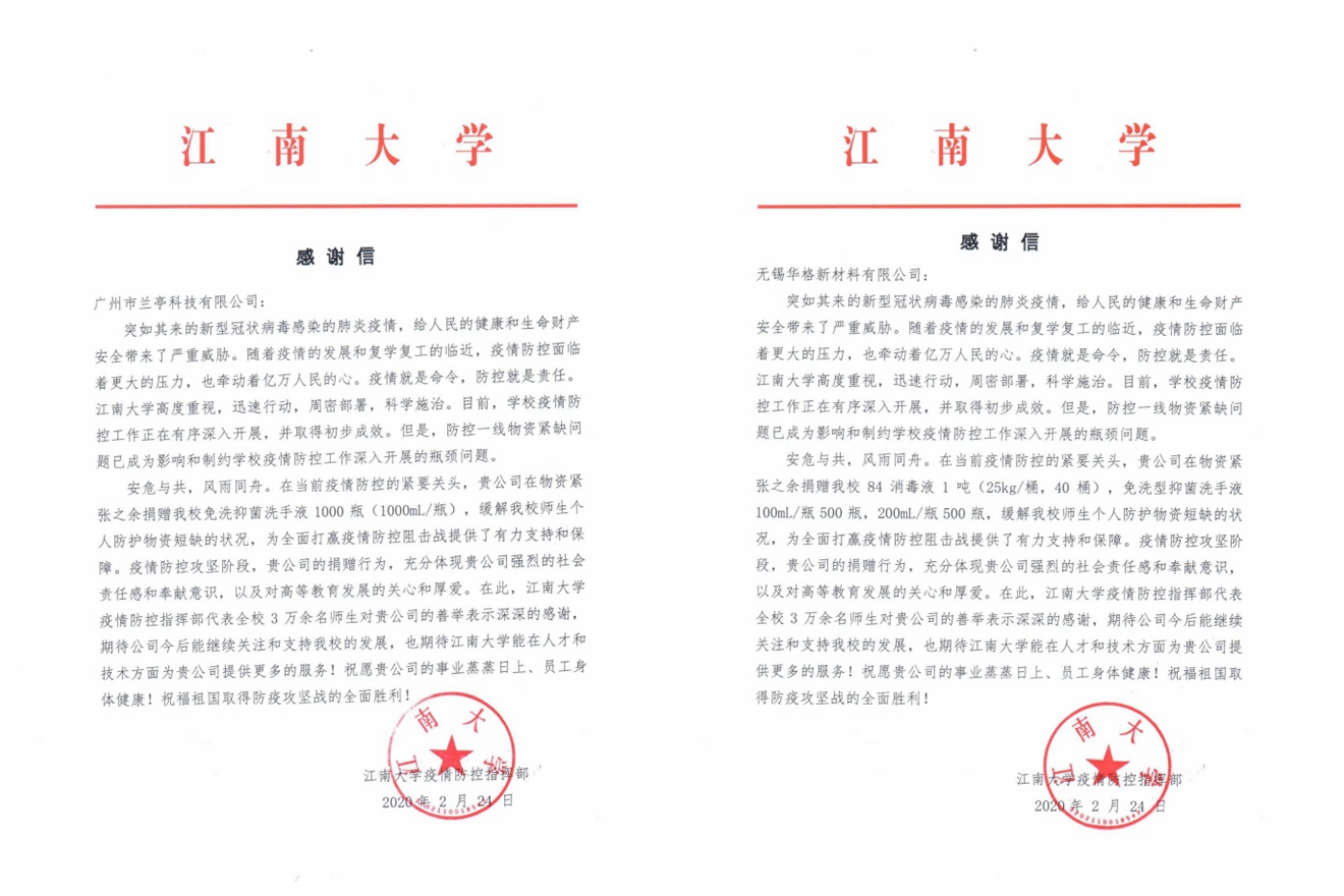 深圳兰亭科技有限公司、无锡华格新材料有限公司捐赠感谢信