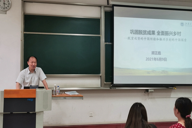 参与脱贫攻坚工作取得的经验、成果,阐述了脱贫攻坚的中国经验和振兴乡村的中国探索,详略得当地概括了我国扶贫开发的历史进程,讲解精准扶贫中必须解决的“扶持谁”“谁来扶”“怎么扶”以及“如何退”四个关键问题。讲述党和国家如何通过制定一系列的方针政策克服重重困难来实现 “全面脱贫”的伟大目标,引出了他对学生们在今后学习工作中的三点寄语:一是勤于思考,勇于创新提出举措;二是明确目标,满怀自信为之奋斗;三是脚踏实地,不务空名落实政策。在课程临近结尾,顾正彪副校长再次以“全面脱贫”伟大事业为例,强调“同学们一定要坚决拥护并理解领会国家的各项方针政策,正面看待政府为实现目标所采取的各项举措”。