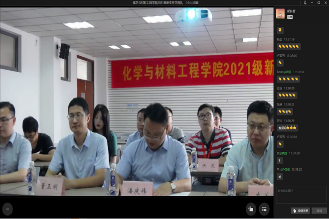 2021级新生开学典礼在化工楼A316会议室举行。鉴于当前疫情防控形式,本次开学典礼采用线上线下相结合的方式举行。学院党委书记潘庆伟,院长东为富,副书记、副院长田卫平,副院长董玉明,副院长马丕明,副院长顾志国以及各新生班主任,各年级辅导员出席本次开学典礼。典礼由2021级辅导员郝林青主持。全体本、硕、博新生通过网络直播同步观看了典礼现场。