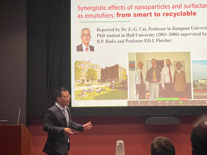 崔正刚教授自2006年底回国以来,在本院组建了表面活性剂和胶体科研团队,与B.P. Binks教授保持紧密合作,15年来在表面活性剂-纳米颗粒协同稳定智能乳状液方向开展了高水平持续研究,迄今团队已与Binks教授合作发表SCI论文26篇,其中Angew. Chem. Int. Ed. 5篇,Chem. Sci. 1篇,Green Chem. 2篇,Food Hydrocolloids2篇,Langmuir 10篇,Soft Matter及其他6篇。本次40 min的报告展示了崔正刚-蒋建中团队(包括宋冰蕾和裴晓梅副教授)近15年来紧密协作指导博士和硕士研究生获得的系统研究成果。