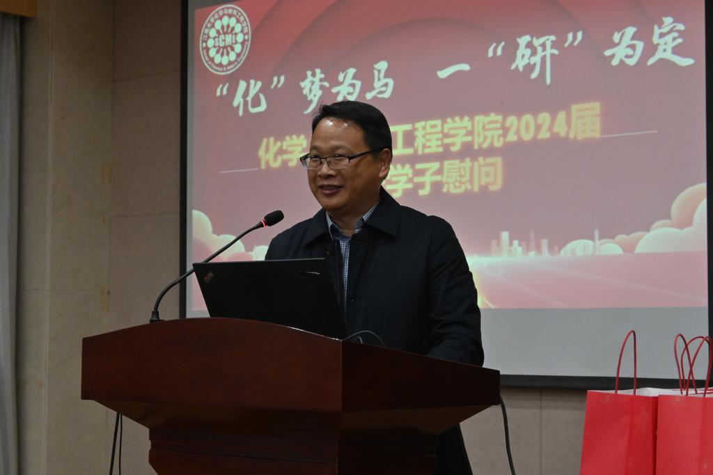在化工楼B329会议室举办“化”梦为马,一“研”为定2024届考研学子慰问活动,学院党委书记潘庆伟,党委副书记、副院长董霞,班主任林良良、徐鹏武、刘凡、孙亚娟、陆双龙及部分考研学生出席活动。活动由学工办主任兼分团委书记、2020级本科生辅导员鞠峰主持。