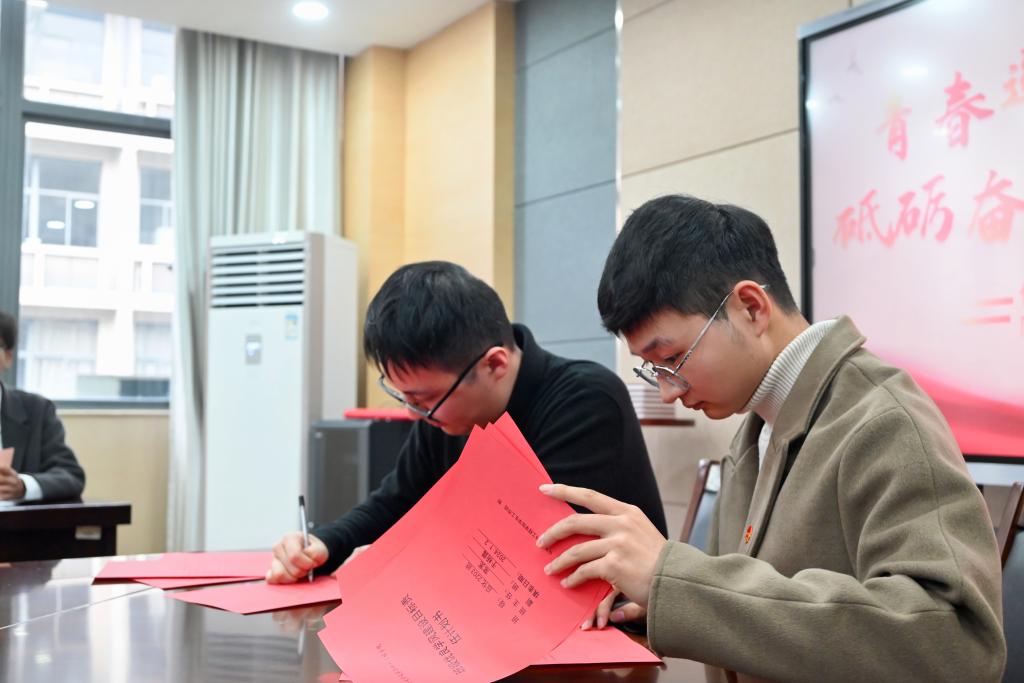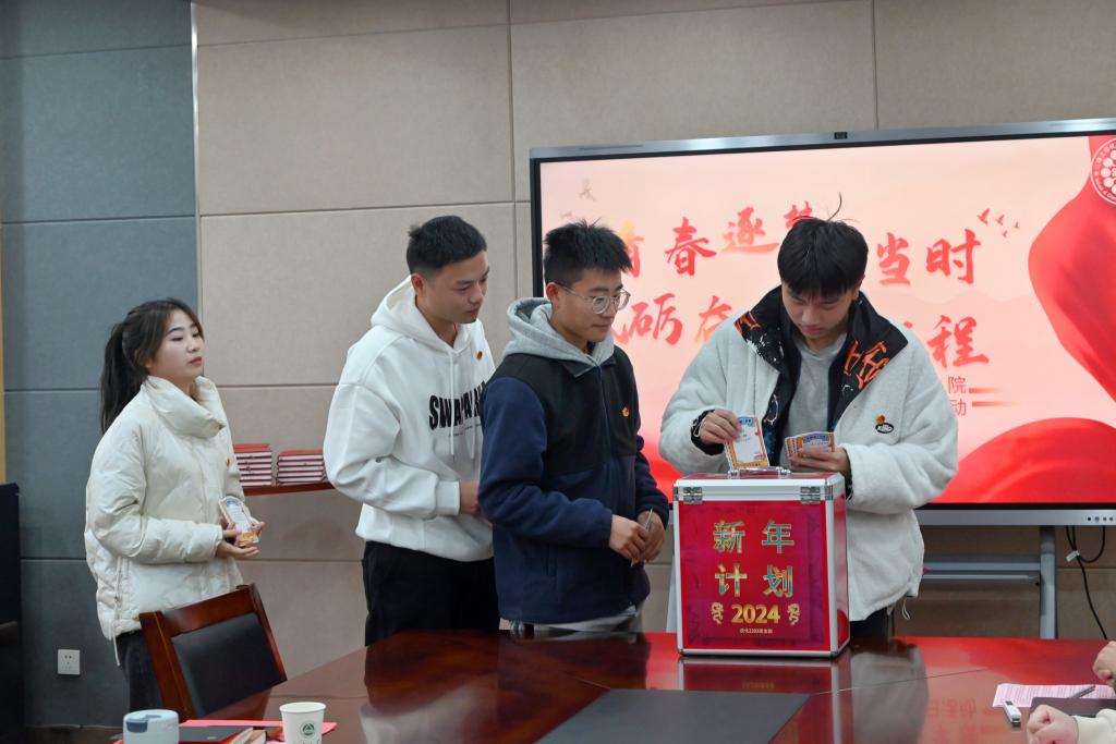 活动在央视短片《2023,记得》中拉开帷幕。短片回顾了过去一年我国在攻坚克难中不变的热情与坚守,其中不乏青年人勇担重任、冲锋在前的身影。观看视频后,班长付博元领学了习近平总书记新年贺词,引导同学们从贺词中领会总书记对青年的关心期望,汲取奋进力量。随后,他总结了2023年班团工作,并对2024年的班团建设提出了展望和目标。接下来,国家奖学金获得者陈鲁文,团支书、至善生李子洋,校级重点大学生创新项目负责人王东仑依次发言,分享了他们的新年计划。全体同学书写了自己的新年计划卡,并投入班级新年计划箱,待次年开启时一同见证更好的自己。接着,班主任常宽和班长付博元共同签订《班级优良学风建设目标责任计划书》。