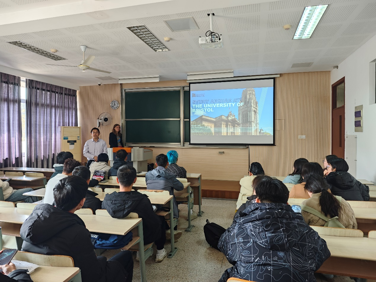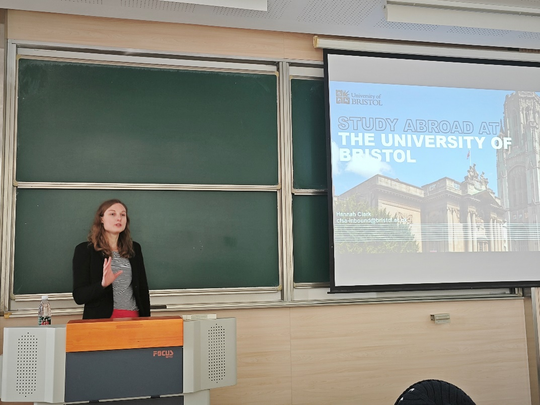 接着,Hannah Clark分别从各类项目申请条件、学习与生活环境、学生活动、学费缴纳、奖学金申请等方面对布里斯托大学进行了更为详细的介绍,进一步介绍了参与上述学生联合培养项目的优势。最后在互动问答环节,同学们踊跃提问,马丕明和Hannah Clark共同对这些疑问做出解答,使同学们对双方国际交流和学生联合培养项目有了更加全面的认识。