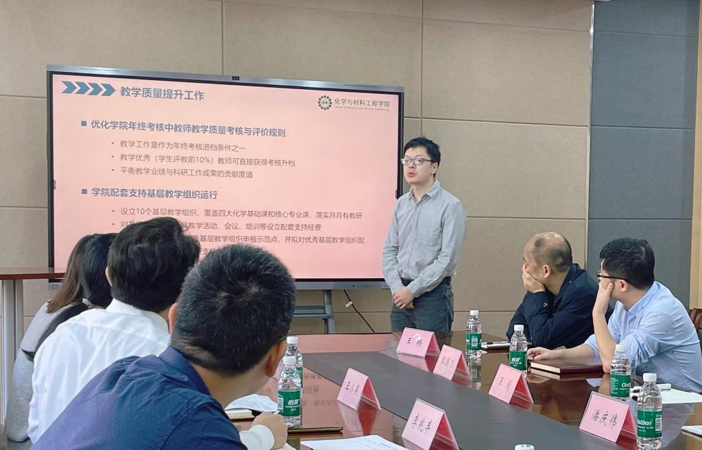 王靖汇报了学院教学质量提升的创新和特色举措、教学改革项目推进情况、教学成果奖培训进展、教学条件建设现状,以及下一步工作重点和当前本科教学工作中存在的问题。