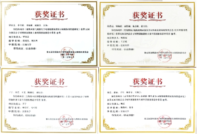 高分子纳米复合材料课题组的“‘锆’枕无忧”团队的《聚酰亚胺气凝胶复合电池隔膜的常压干燥制备及性能研究》项目(成员:罗寅景、李雪婷、李钰婵、周康杰、吴为;指导老师:张龙生、刘天西)获得金奖;“双隐纤锋”团队的《层级阻抗/隔热聚酰亚胺复合材料的高效构筑及其雷达/红外双隐身性能研究》项目(成员:杨思远、邹佩媛、凌晨阳、朱彦晓、张雪洁;指导老师:王子成)获得银奖。环境友好与功能复合材料课题组“燃不可及”团队的《生物基本征阻燃聚氨酯的构建及性能研究》项目(成员:丁宁、杨艺、王进、陈国庆、黄辰靖;指导老师:杨伟军、马丕明)获得银奖;“木维新生”团队的《高生物活性PVA/木质素-维生素B水凝胶敷料的制备及性能研究》项目(成员:杨艺、张雨、丁宁、杨丰宇、王枫宁;指导老师:杨伟军、徐非)获得铜奖。张龙生副教授、王子成副教授、杨伟军副教授均获得“优秀指导老师”荣誉称号,黄漫