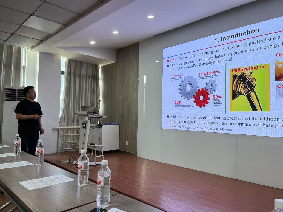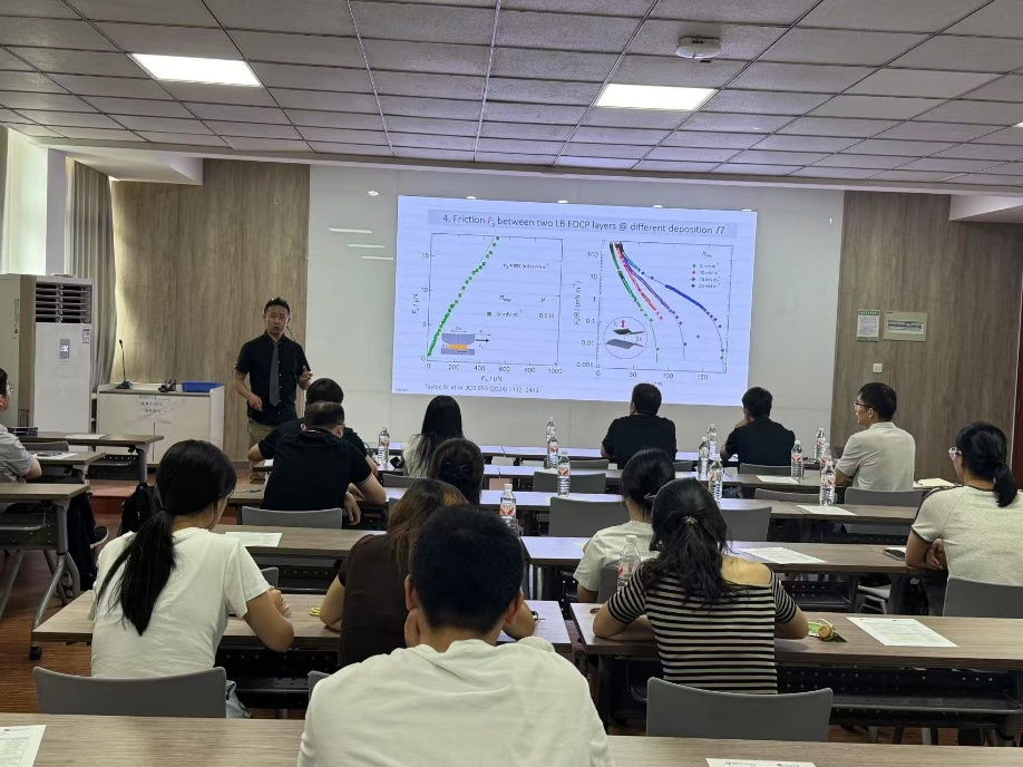 研讨会上,马丕明副院长首先对三位教授的来访表示热烈欢迎,并简要回顾了布里斯托大学与化工学院之间学术合作与交流的历史。研讨会分别由马丕明副院长和Wuge Briscoe教授主持。Wuge Briscoe教授做了题为“Centipede” Statistical Polymer under Nano-confinement: Surface Forces, Superlubricity, and Transient Interfacial Gels的报告,吴新虎研究员、王刚副研究员、孙冠卿教授、杨伟军副教授、蒋航副教授、祝宇微副教授、宋冰蕾副教授分别针对各自领域做了学术报告,内容涉及离子液体组装与润滑性能、脂多糖的超分子组装、界面颗粒的行为及稳定机制、聚氨酯弹性体、微凝胶软颗粒作为乳液界面开关的行为、用于引导组织再生的生物界面涂层以及表面活性剂形成的热增稠流体等方面。报告内容丰富,与会人员展开了热烈讨论与互动。会后,Wuge Briscoe教授对本次研讨会进行了高度评价。