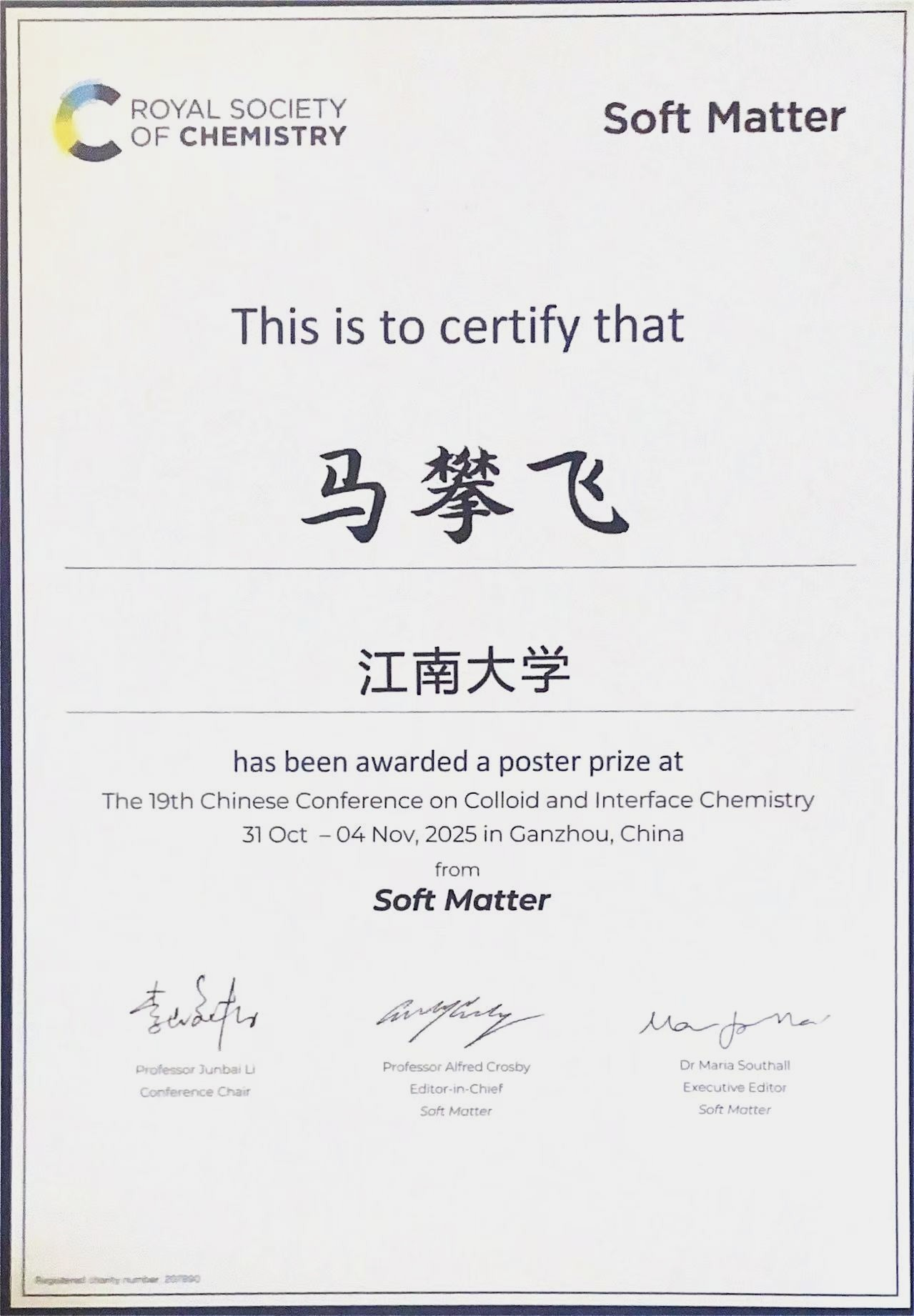 依托合成与生物胶体教育部重点实验室,在胶体与界面化学领域形成了特色鲜明、优势突出的研究体系。此次马攀飞同学荣获RSC优秀墙报的荣誉,不仅是研究成果在全国性学术舞台上精彩亮相,更彰显了黄漫