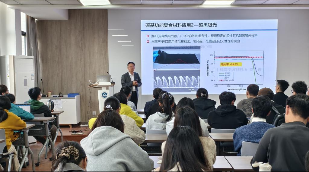 最后,刘小青研究员结合国家战略与国际趋势,总结展望环境友好环氧树脂及复合材料发展,提出“绿色化、可回收、高性能”研发方向并构建创新链条同时,他延伸介绍了碳基功能复合材料的多元应用:C-C焊接领域中展现优异连接性能,为碳基材料工程化应用开辟新路径;超黑吸光领域中,材料制备条件温和且吸光率超99.5%,远超商用植毛布,在光学、航天等领域优势独特。这些内容极大拓宽了师生学术视野,让大家看到材料科学与多学科交叉的无限可能。