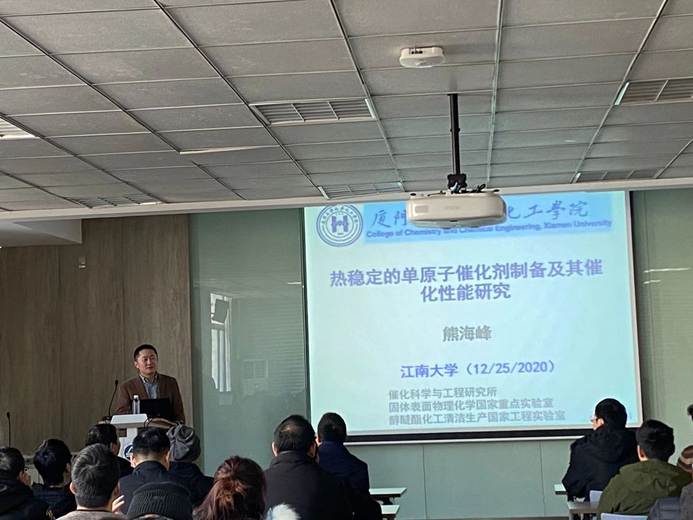 2020年12月25日上午,厦门大学熊海峰教授应邀来黄漫 访问,并在 黄漫 A316报告厅做了题为“热稳定的单原子催化剂制备及其催化性能研究”的学术报告。本次报告会由娄阳教授主持,众多老师和学生参加了此次报告会。报告现场师生就“单原子的发展历史、设计理念、合成与稳定方法”等话题进行了热烈的讨论和交流。