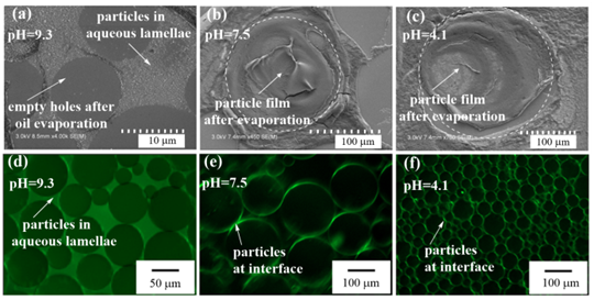 图2新型头基电荷可逆转变型表面活性剂(DMUa)的结构及其(0.5mM)与纳米二氧化硅(0.1wt.%)协同稳定的乳状液的微结构及pH-响应性。(a)和(d) oil-in-dispersion乳状液,(b)和(e)大油滴Pickering乳状液,(c)和(f)小油滴Pickering乳状液