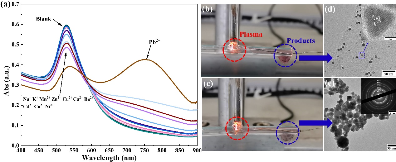 在前期工作中,研究团队巧妙地将等离子体和微流控技术耦合,首次提出“微流控等离子体”(Microfluidic Plasma)的创新思路(Chem Eng J, 2021, 417, 129355; Chem Eng J, 2021, 425, 131511)。本工作进一步发展微流控等离子体过程强化技术,以HAuCl4和葡萄糖为前驱体,建立连续化制备AuNPs比色传感器的方法。通过系统的研究考察反应参数与传感性能之间的关系,包括pH、响应时间、灵敏性、选择性和真实水样检测性,借助原位光谱检测技术探讨了反应机理。此外,耦合铅离子实现了反应-检测的高效集成(30 s内完成,图2)。该研究成果显示微流控和等离子体耦合能衍生出一种新型高效的过程强化方法,为化学化工反应提供新途径。19级硕士生李煊赫(现大连理工大学博士生)为本工作第一作者。