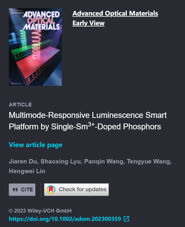 林恒伟教授光功能材料研究团队,在无机智能响应性发光材料上取得研究进展,相关成果以“Multimode-Responsive Luminescence Smart Platform by Single-Sm3+-Doped Phosphors”为题发表在光学权威期刊Advanced Optical Materials上(原文链接://onlinelibrary.wiley.com/doi/10.1002/adom.202300359)。该项工作的主要贡献者为硕士研究生吕绍星、王潘琴和王腾跃同学,论文的通讯作者为林恒伟教授、杜家仁副教授。