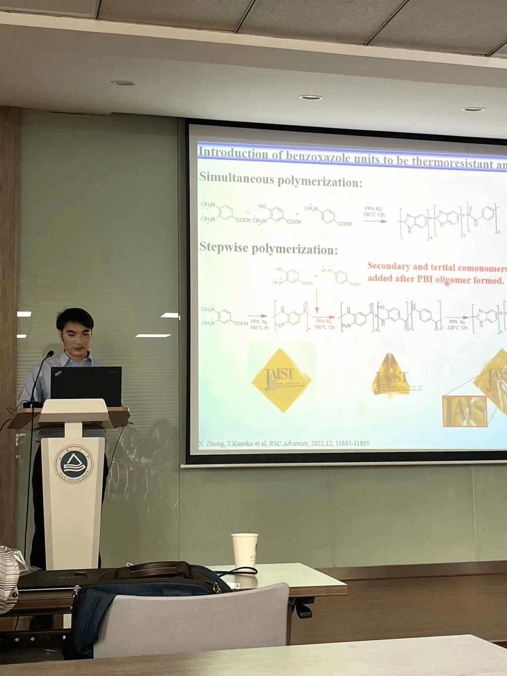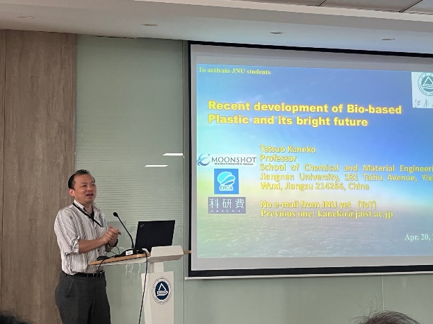 Tatsuo Kaneko教授报告主题为“Recent development of Bio-based Plastic and its bright future”。他着重介绍了生物基塑料的最新发展及其光明前景。分为以下几个部分:1、简单清晰地介绍了生物基聚合物的可控降解以及首次发现的水中的光化学反应赋予高分子材料光引发水解的能力;2、重点介绍了衣康酸基生物尼龙,基于衣康酸和二胺,通过改变聚合方法,开创了“盐类单体的本体聚合方法”,可以利用衣康酸的双羧基和双键形成吡咯烷酮环,从而得到衣康酸衍生的耐高温生物尼龙;3、还介绍了几种高性能生物塑料,其力学性能可与聚甲基丙烯酸甲酯、聚丙烯等相媲美,在生物塑料的发展具有一定的引领作用。Tatsuo Kaneko教授与钟显铸博士的报告非常详实,生动丰富,令人耳目一新,引起了在座师生的积极交流和讨论,师生们纷纷表示受益匪浅。