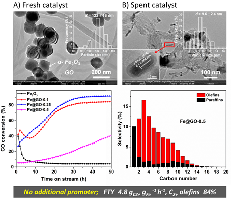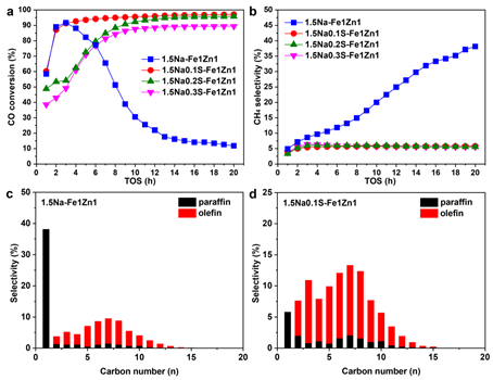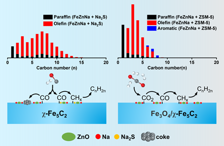 3.FeZnNa+Na2S催化合成气一步高效制长链α-烯烃,以及FeZnNa耦合H-ZSM5纳米片分子筛两段催化CO2加氢/裂解高效制低碳烯烃