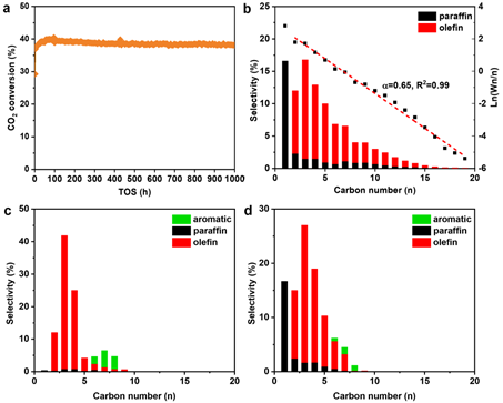6.CO2费托合成反应制低碳烯烃一段反应性能结果(a, b)、长链烃类分段裂解产物选择性(c),以及综合产物分布(d)