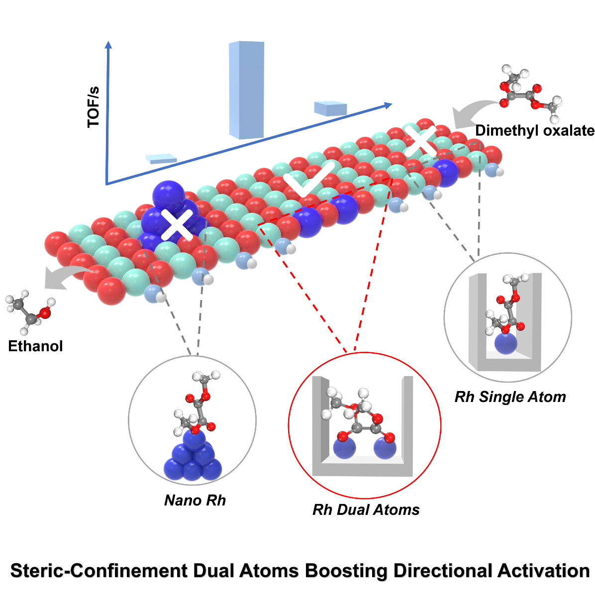 在这项工作中,“边缘限域”Rh双原子活性中心具有精准的原子-原子间距(3.5 Å),精准匹配草酸二甲酯中双C=O键中两个O原子的间距(3.1 Å),而且其“口袋型”几何结构(2.8×6.4 Å),显示出独特的空间限域效应,实现了在分子水平上定向调控DMO的吸附构型,选择性活化特定的C=O键,从而通过独特的“单边活化机制”,高效产生乙醇。在240oC/8h, 1 MPa H2的反应条件下,Rh2/MoS2DAC对乙醇收率>96%;在可比较的反应条件下,其转化频率(TOF)是文献报道最佳值的19倍;实际H2/DMO摩尔比(5.2)接近理论化学计量比(5.0),较文献报道的最低值低17倍,从而将显著降低高压氢气的循环使用成本,显示出良好的应用前景,这有助于重塑全球能源和大宗化学品原料框架,助力国家“双碳”战略和新质生产力的发展。