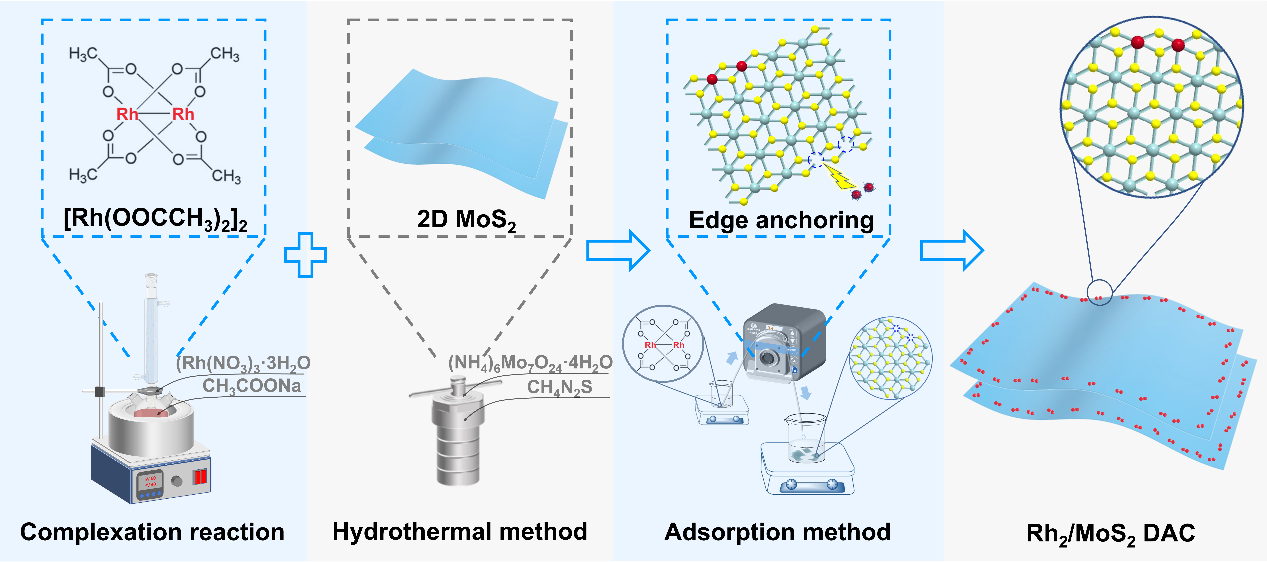 1. Rh2/MoS2DAC合成路线和模型的示意图。