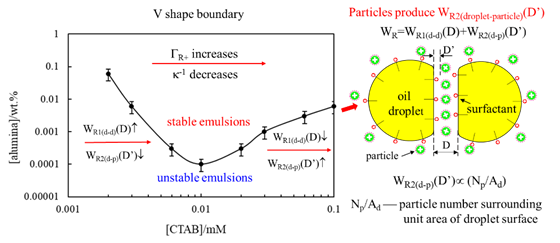 研究人员以稳定OID乳状液所需的最低表面活性剂浓度(Cs)和最低纳米颗粒浓度(Cp)之间普遍构成V-型边界为突破口,基于经典的DLVO理论,建立了数学模型,从而可以定量计算OID乳状液体系中沿V-型边界的相关吸引和排斥势能。研究结果表明,在较大距离上,纳米颗粒被油滴吸引从而分布于油滴周围,而当油滴因范德华引力作用而相互靠近时,纳米颗粒会在油滴之间形成隔离层。尽管颗粒在油滴表面的表观覆盖度极小(0.0032-2.9%),但颗粒-油滴排斥作用叠加油滴-油滴排斥作用足以阻止油滴之间进一步靠近而发生絮凝和聚结。当Cs较低时,稳定乳状液所需的Cp随Cs增加而下降,但当Cs较高时,由于体系中反离子浓度增加,双电层的排斥效应减弱,稳定乳状液所需的Cs和Cp需要同步增加(构成V-型稳定边界)。
