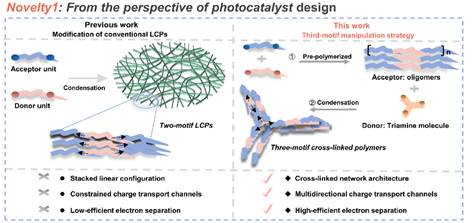 基于此,董玉明/朱永法团队在现有双基元线性聚合物中引入了“第三基元”,成功制备出新型三基元交联聚合物光催化剂。这种创新设计不仅精确调控了聚合物材料的电子结构,显著降低了激子结合能,增大了分子偶极矩,其交联网络结构如同四通八达的“高速公路”,为电子提供了多方向传输通道,极大地促进了激子解离和分子内电子转移。因此优化后的三基元PAQ-TABPB光催化剂展现出卓越的活性,将氧气转化为超氧自由基的速率大大加快,从而促进了两步单电子氧还原路径,实现了高达3351 µmol g⁻¹ h⁻¹的双氧水生产速率,远超传统的双基元聚合物,并且其实现了0.36%的SCC和420 nm下6.26%的AQY。