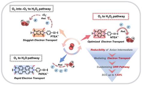 此外,针对多样化的氧气还原路径进而导致H2O2生产效率低下的挑战,董玉明/朱永法团队提出了一种全新的策略,即通过调控含阴离子中间体型的共轭有机聚合物光催化剂的电子传输动力学,来定制一步双电子的O2还原路径以高效率的合成H2O2。区别与现有的机理研究主要集中在热力学控制的范畴如在O2吸附能和中间体自由能。实验与表征结果相结合,证明了增强的电子传输能将ORR路径从两步双电子过程转变为单步双电子路径,从而实现高效的H2O2生产。相反,当电子转移变得加快时,反应会从期望的双电子路径转移到与之竞争的四电子路径副反应,从而严重影响H2O2的选择性。具有优化电子转移动力学的萘酰亚胺阴离子中间体表现出卓越的性能,实现了高达6372 μmol g⁻¹ h⁻¹的H2O2生产速率。大面积的NTEA膜光催化剂在连续流动反应器中产生了1150 µmol L⁻¹的H2O2浓度。这项研究不仅从反应动力学的角度为控制光催化反应路径建立了一个新见解,也为设计含阴离子中间体的光催化剂的发展提供新思路。