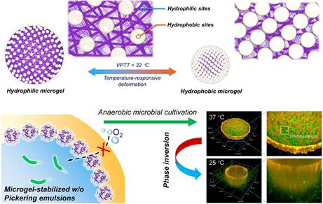 特聘教授)被邀请于本期的Author Spotlight采访。魏涛教授提到,此次研究成功突破了胶体科学与生物制造之间的壁垒,通过对微凝胶软颗粒的巧妙改性,实现了37 °C下的微生物稳定培养与室温下的高效分离。这种智能乳液相反转技术,在厌氧发酵领域,有望大幅提高厌氧微生物的生长活性,提升生物催化和细胞工厂微反应器中的产品分离效率,产出更多高附加值产品,在合成生物学和生物制造等多个领域展现出广阔的应用前景。