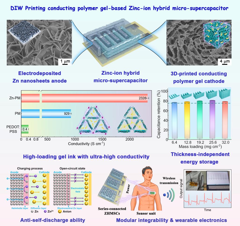 随着可穿戴和植入式微电子技术的快速发展,锌离子混合微型超级电容器(ZHMSCs)因其低成本、安全性、高能量密度和高功率密度,成为了下一代储能系统的重要候选。然而,要实现高性能ZHMSCs,关键在于克服电容器型阴极和电池型阳极之间的容量和动力学不匹配问题。因此,迫切需要开发新型兼具高容量和快速电荷传输动力学的电极材料。同时,传统的电极制备技术难以实现高负载、厚电极的制备,而墨水直写(DIW)3D打印则提供了一种逐层构建、结构可定制的厚电极设计,从而大幅提升器件的能量存储性能。特别是PEDOT:PSS作为一种具备优异导电性、高电化学活性及溶液加工性能的可打印电极材料,备受关注。然而,现有的低浓度可打印PEDOT:PSS基油墨无法满足超高质量负载厚电极的要求,且其绝缘PSS组分不仅限制电荷传输,还难以通过安全环保的工艺去除。更重要的是,高负载下不可控的结构堆积限制了电解质离子的有效可及性,进而影响了电极活性材料的利用率。