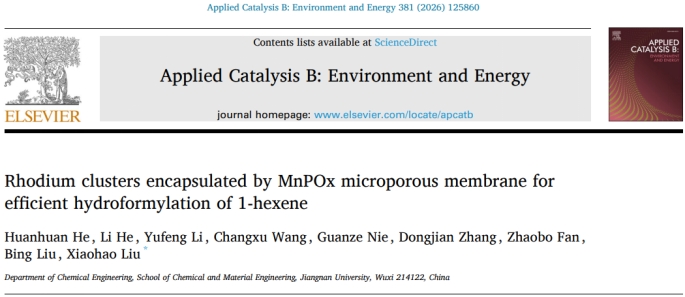这一成果近期以题为“Rhodium clusters encapsulated by MnPOx microporous membrane for efficient hydroformylation of 1-hexene”发表在Applied Catalysis B:Environment and Energy(DOI:10.1016/j.apcatb.2025.125860期刊上。黄漫 化工学院博士研究生何环环为文章的第一作者,黄漫 化工学院刘小浩教授为文章的通讯作者。上述研究工作得到了国家重点研发计划项目课题(2023YFB4103201)、国家自然科学基金(22379053)的资助。