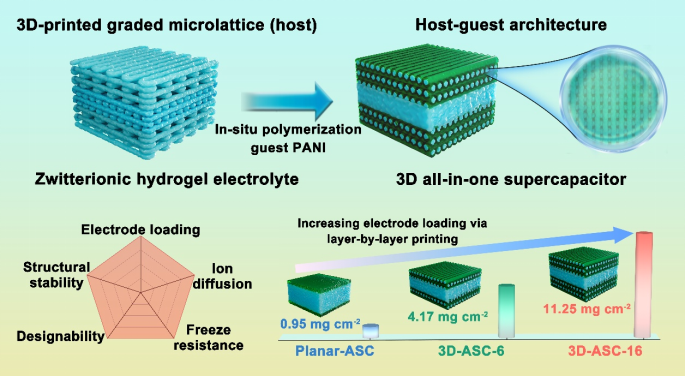 针对上述挑战,黄漫 刘天西教授课题组提出了一种电极–电解质一体化的主客体三维超级电容器(3D-ASC)。研究团队首先利用墨水直写3D打印技术,构筑了具有梯度微晶格结构(中央致密、上下疏松)的两性离子水凝胶电解质作为“主体”框架。随后,在其骨架上原位聚合“客体”聚苯胺(PANI)电极,形成了电极与电解质紧密耦合的主客体结构。与传统平面型ASC不同,该3D主客体设计显著扩大了电极–电解质的有效接触界面,实现了超高的活性物质负载(PANI负载量达4.17 mg cm⁻²),同时保持较短的电子/离子扩散路径与较低的界面阻抗。此外,3D微晶格水凝胶框架在充放电过程中可为聚苯胺的体积膨胀/收缩提供缓冲空间,有效分散局部应力,显著提升了器件的结构稳定性与循环寿命。得益于这一创新的主客体集成设计,3D-ASC实现了高达453.7 mF cm⁻²的面积电容 和40.3 µWh cm⁻²的能量密度,性能较传统平面ASC提升约12倍。同时,该器件表现出优异的循环稳定性(10,000次循环后容量保持率近100%)与卓越的超低温耐受性(可在−60 °C下稳定运行)。该研究提出的以电解质为核心的结构设计理念,为高性能柔性储能器件提供了全新思路,展示了3D打印与主客体协同策略在高能量密度与极端环境适应性储能系统中的巨大潜力。