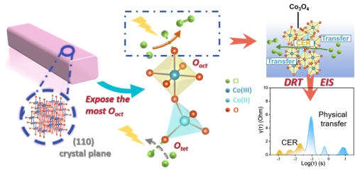 氯气是医药、水处理等领域的关键化学品,目前主要通过氯碱工艺中的电催化氯析出反应(CER)来制备。尽管CER在动力学上具有优势,但现有催化剂在酸性条件下往往活性不足、稳定性差,而常用尺寸稳定阳极又依赖贵金属,成本高且效率有限。针对上述问题,本研究合成了三种不同晶面取向的Co3O4催化剂:Co3O4-[110]、Co3O4-[100]和Co3O4-[111]。其中,Co3O4-[110]表面富含八面体配位氧(OOCT),在CER中表现出最优的性能,仅需95 mV过电位即可达到10 mA cm-2,并能稳定运行超过80小时。研究首次将弛豫时间分布(DRT)技术应用于CER过程分析,发现Co3O4-[110]在相同电位下具有最低的主导阻抗(EIS),且物理传质过程控制反应起始阶段。理论计算进一步揭示OOCT为CER的关键活性位点,不同晶面在电导率、氯吸附能力及电子转移效率方面的差异共同决定了其催化性能与稳定性。该研究不仅深化了对CER机理的理解(图2),也为设计无贵金属、高性能析氯电解催化剂提供了新思路,助力电化学工业向更可持续方向发展。