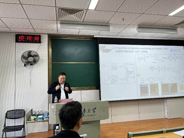 报告会聚焦于高性能聚酰亚胺,受DNA中发现的腺嘌呤结构的启发,通过绿色合成路线成功地将腺嘌呤引入聚酰亚胺主链中。得益于分子间的强氢键,实现了聚酰亚胺高玻璃化转变温度、高耐热性能以及高储能模量。通过取向-铰链模型对其面内取向的特性进行了深刻的阐释,充分挖掘了在电子元器件、锂电池、碳氮掺杂材料等领域的应用价值,展示了从“自然灵感设计”到“高性能实施”的闭环发展。本次报告会引起了广大师生的兴趣,现场反响热烈,在场的师生就相关学术问题进行了热烈的讨论与交流。