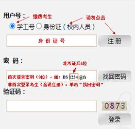 财务处”或登录“”,完成缴费。考生账号已开通,切勿自行注册。收费标准:80元/生(仅申请考核考生,硕博连读考生无须缴费)。用户号在“学工号”输入正确的身份证号,初始密码(9位):“BS”+准考证编号后4位+“@fs”,(准考证查看网址:),如“BS1234@fs”。非首次登录缴费系统的考生(含往年报考考生及误注册考生)请使用“找回密码”,登录并缴费。